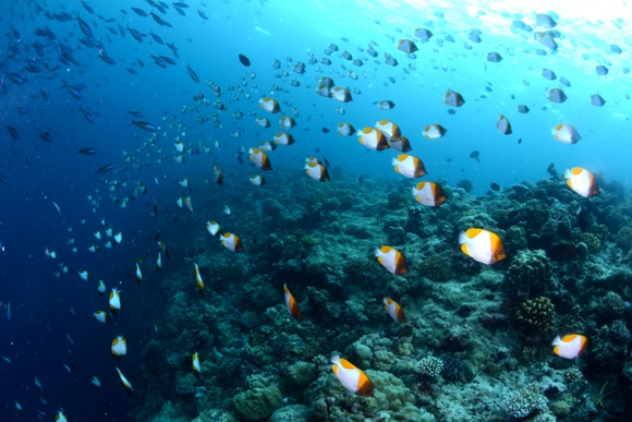 そしてその外側にはカスミチョウチョウウオ!これまた乱舞!