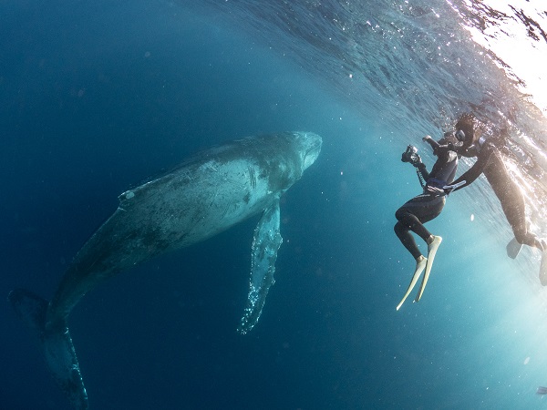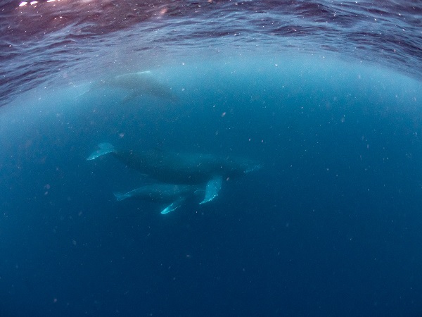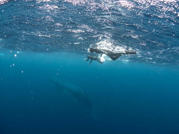 クジラの観察は水面からのみとし、素潜りは禁止とします。クジラによっては、人が近くを泳ぐことを嫌い、逃げてしまう場合があります。そのため、原則として緊急時やガイドの指示がある場合を除き、クジラの近くでフィンキックなどをして泳ぐことも禁止します。クジラは一度でもそのような行動を取る人間を嫌がってしまうと、その後スイムで近づくことができなくなる場合が多いため、必ずこれらの事項をお守りください。