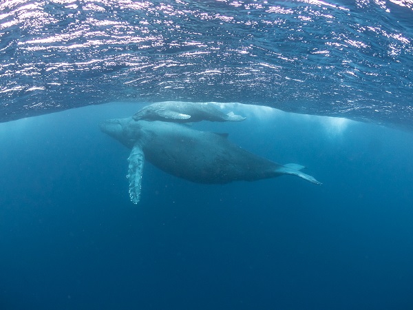 クジラの観察は水面からのみとし、素潜りは禁止とします。クジラによっては、人が近くを泳ぐことを嫌い、逃げてしまう場合があります。そのため、原則として緊急時やガイドの指示がある場合を除き、クジラの近くでフィンキックなどをして泳ぐことも禁止します。クジラは一度でもそのような行動を取る人間を嫌がってしまうと、その後スイムで近づくことができなくなる場合が多いため、必ずこれらの事項をお守りください。
