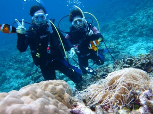 休憩中に水面にて遊んでいるお二人を水中から撮影してみました♪素敵な夏の思い出の一枚になりましたでしょうか♪水面からも、ウミガメのタイマイがエサを必死で食べているところを観察出来ました!本日でコース終了の2人様、これからがダイバーとしての新たなスタートです♪お2人で仲良くダイビングを続けて、素敵な思い出をいっぱい増やしてくださいね^^また、沖縄の海でお二人にお会い出来る日を楽しみにお待ち致しております☆