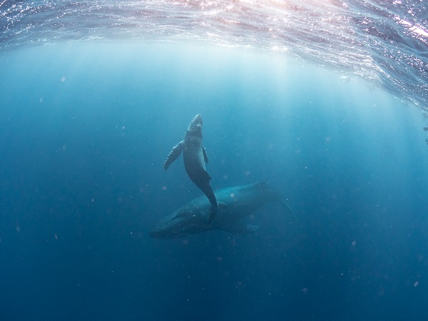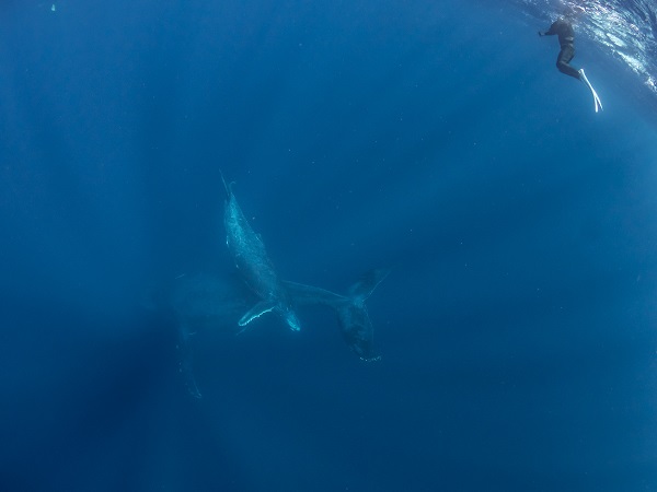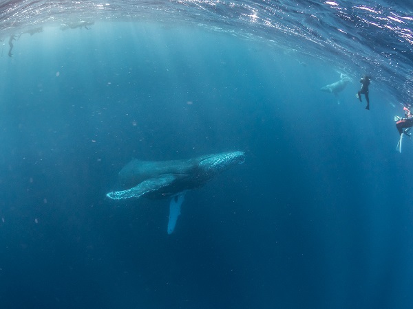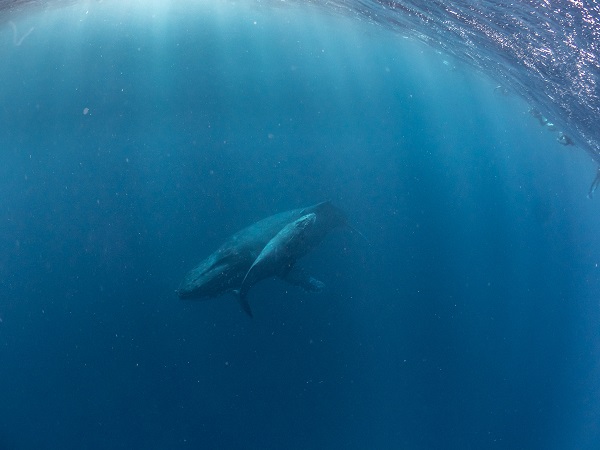 クジラの観察は水面からのみとし、素潜りは禁止とします。クジラによっては、人が近くを泳ぐことを嫌い、逃げてしまう場合があります。そのため、原則として緊急時やガイドの指示がある場合を除き、クジラの近くでフィンキックなどをして泳ぐことも禁止します。クジラは一度でもそのような行動を取る人間を嫌がってしまうと、その後スイムで近づくことができなくなる場合が多いため、必ずこれらの事項をお守りください。